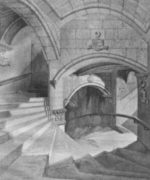 Now this was interesting for, some years prior to any excavation taking place, a discovery was made in the little passage near the Meldrum Tower dressing room, of a stone in the wall which worked on a pivot, and which was exactly over the secret chamber. This stone, set in motion, disclosed a hole, and after some pennies were thrown down, a carpenter's tool tied to a piece of string was lowered until it touched what was thought to be the floor of the chamber. Nothing further was recorded as being done at that time, but it is interesting that the clairvoyant did not see the pennies and the carpenter's tool down there.